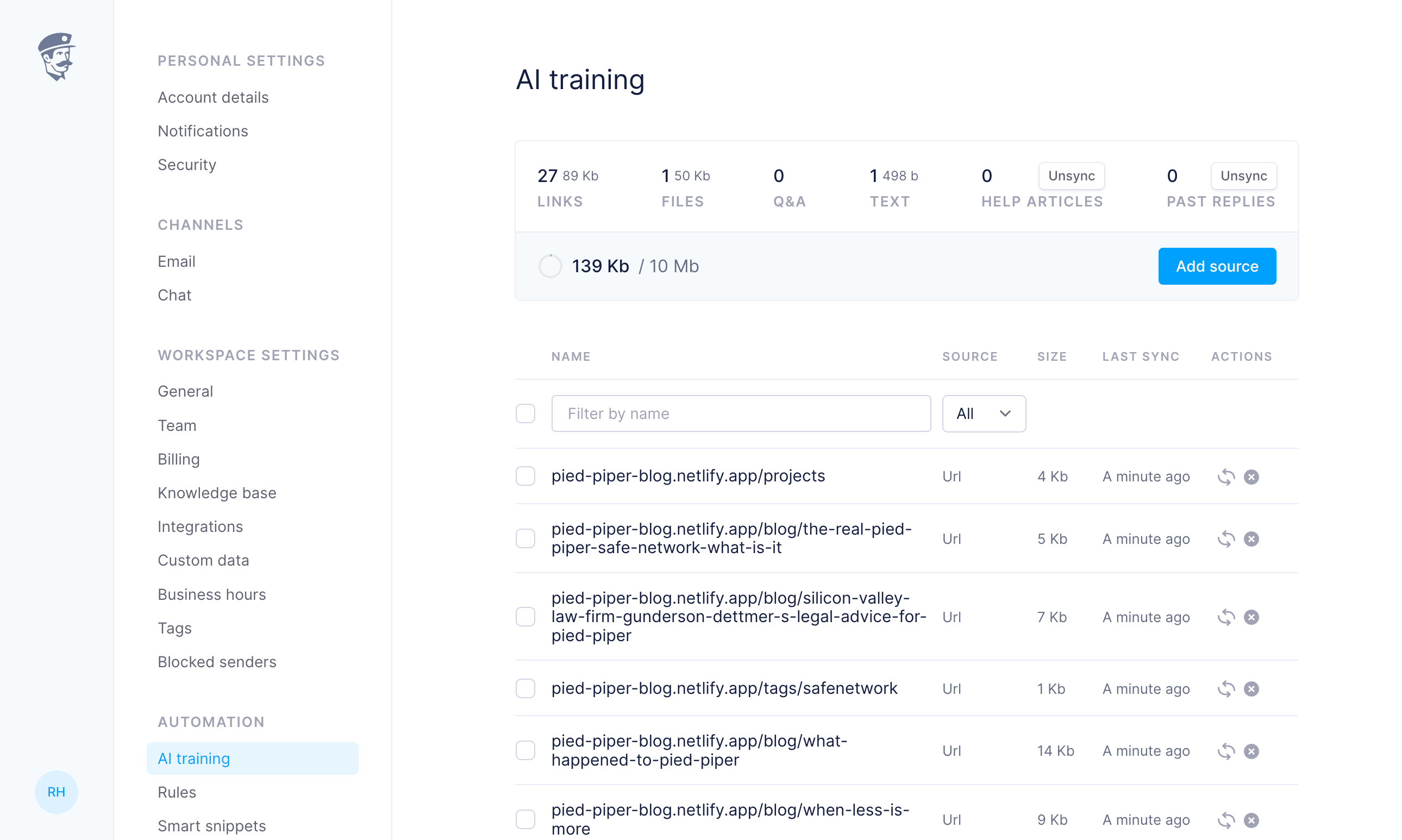 You can add up to 10MB of content: upload TXT, PDF, or DOC files, paste Q&A, add custom URLs, or even auto-scrape your public site. You can also choose to sync your help articles or past replies.