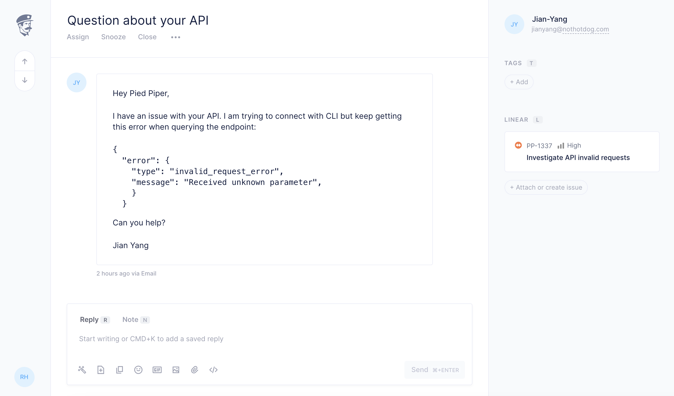 This integration enables a tight feedback loop between customer and product teams using Fernand for customer support. Use it to create Linear issues from customer conversations, link conversations to existing Linear issues, surface key information between tools, and make it easier to get back to customers when bugs are fixed or feedback has been implemented.